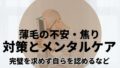 マッサージやツボ押し、生活習慣の見直しは、単なる「薄毛予防」や「血流改善」の手段ではなく、自分の心身と向き合う時間でもあります。セルフケアの時間を持つことで、自分自身をねぎらい、気持ちをリセットできることも少なくありません。